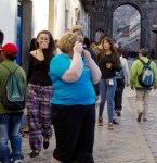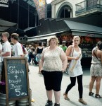 “I now reverse the gaze and record their reactions to me while I perform mundane tasks in public spaces. I seek out spaces that are visually interesting and geographically diverse. I try to place myself in compositions that contain feminine icons or advertisements. Otherwise, I position myself and the camera in a pool of people…and wait.