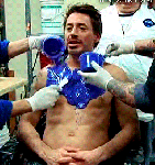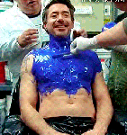 They’re pouring latex on him to make a false chest. So that they can place the arc reactor prop in him and make it legitimately look like it’s embedded in is flesh and with tears and scar tissue. The latex is colored so they can see where they are applying and how thick the layers are. It will then be airbrushed to his skintone and details like nipples scar tissue discoloration will be added.