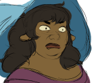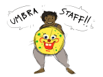 [image description: a series of drawings featuring Lup and Taako. They are twin elves with dark brown skin and black hair. Lup’s hair falls just below her ears. She smiles and says, “Check this out!” She’s holding a folded yellow umbrella with green spots on it, and opens it in front of her to reveal a smiling Spongebob face on the top of it. She announces “umbra staff!” as she does. Taako, who has shoulder-length hair and a teal wizard hat, looks on in disgust.
