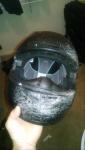 His helmet had this odd discolored patch on it. Like, white against white, but … weird? It’s then that I realized his helmet didn’t have a discolored patch, it had a patch missing. A big chunk of his helmet had just been shaved away, the curve of the helmet gone and sanded flat by whatever it had been scraped against. And running through that patch, from one side of the helmet to the other, was this big crack, like the whole helmet had split like an eggshell.