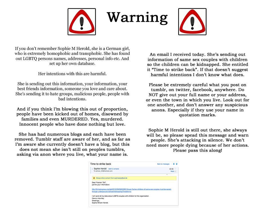 She has had numerous blogs and each have been removed. Tumblr staff are aware of her, and as far as I’m aware she currently doesn’t have a blog, but this does not mean she isn’t still on peoples tumblrs, asking via anon where you live, what your name is. An email I received today. She’s sending out information of same sex couples with children so the children can be kidnapped. She entitled it “Time to strike back”. If that doesn’t suggest harmful intentions I don’t know what does.