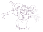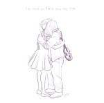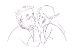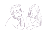 [ID: Six digital sketches of Barry and Lup. Barry is a heavyset, middle-aged, human man with short, wavy dark hair and glasses. Lup is a slender, elf woman with light, long, straight hair and freckles. In the first drawing, Barry has her slung over his shoulder, and they are both laughing.The next three drawings are a sequence: First, Barry puckers his lips at Lup. Then Lup leans in to kiss him. He then grabs her by the cheeks and blows a raspberry on her mouth, to her surprise. The next drawing depicts Barry and Lup closely snuggled together in bed. Their cheeks are squished together and their limbs are draped over each other as they sleep. Lastly, there is a drawing of the two of them dressed in more formal outfits, and they are hugging each other. Their faces are hidden, buried in each others’ shoulders. Lup is holding a violin behind his back. Small text written above them reads “I’ve loved you for a very long time.” End ID.]