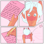 In the next panel, we see the letter. It reads “Hey Lup, You’re my best friend and the most beautiful girl I’ve ever met. I have to be honest with you: I’m kinda head over heels for you. I have been since like 6th grade when you stared me down (Lup’s thumb obstructs some text) poured your mac” and ends there. The panel besides shows a closeup of Lup’s face, looking surprised and blushing.