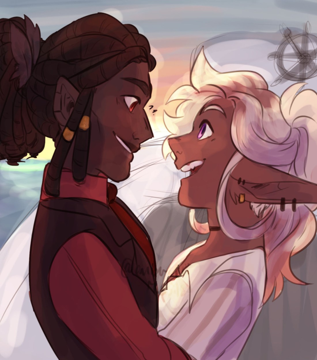 [Start ID: the adventure zone fanart showing taako and kravitz. Kravitz is a dark skinned man wearing a red button up and black waistcoat. He has dark brown dreads pulled back from his face and he’s shown from the side grinning brightly at taako, a medium complexened elf with a long blonde braid wearing a white tunic and smiling up at kravitz. They have their arms around each other and behind them is the ocean and the bow of a boat. End ID]