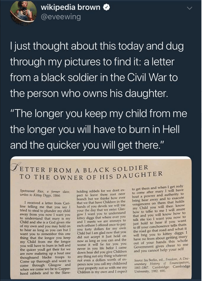 I just thought about this today and dug through my pictures to find it: a letter from a black soldier in the Civil War to the person who owns his daughter. “The longer you keep my child from me the longer you will have to burn in Hell and the quicker you will get there.“