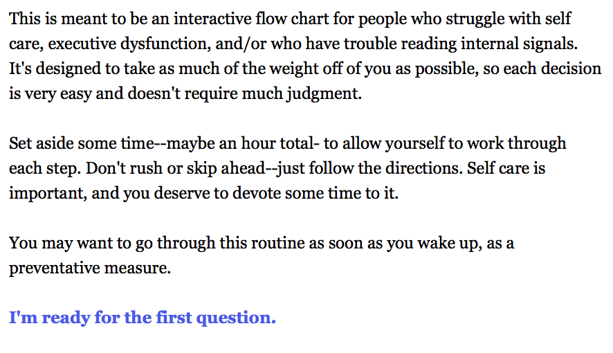I’m feeling ok right now and am about to settle into bed (but this was scheduled hence the early morning post) but I flipped through it for awhile just to see what it is like and holy crap it’s like a choose-your-own-adventure of self-care activities that not only aims to engage you in positive feel good behaviors but also tries to match its suggestions to your level of energy/ability/can even.