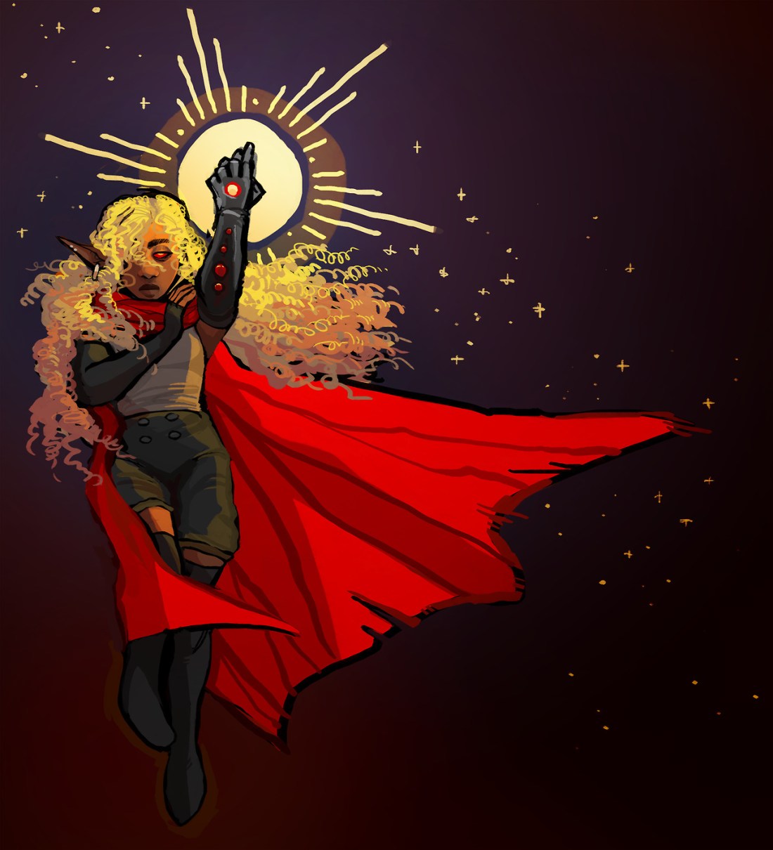 [Start description: a drawing of Lup, an elf with brown skin and long curly blond hair and a long, red robe trailed out behind her. Her hand is raised and wearing the Pheonix Fire Gauntlet with a circle of light shining behind it. End description.]