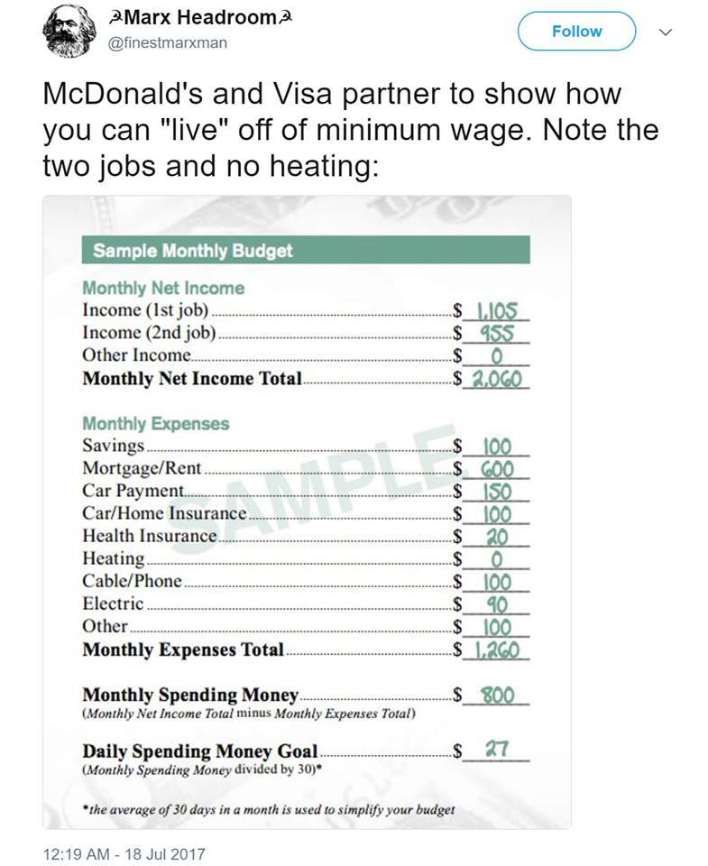 Medical expenses? Car maintenance? Gas money? Childcare? Hygene supplies? Water, Natural gas bill, Dental, Cleaning supplies? Student Loans? If we’re talking a normal household and decent life, veterinary care and clothing? And if you get sick and can’t work ya two jobs?