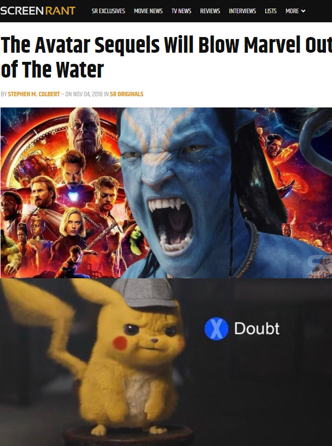 Avatar holds 2nd for the most money *ever* in the box office, when adjusted for inflation. Avengers is 13th. Avatar is the all-time worldwide highest grossing movie of all time too. Like Marvel is good at making movies but probably not gonna do better than Avatar