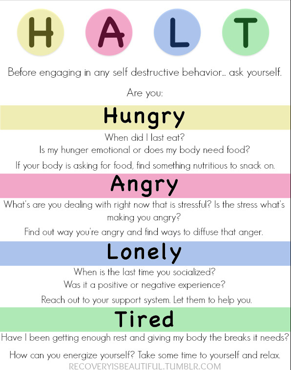 [Image: the letters H A L T are at the top. Below is the text “Before engaging in any self-destructive behavior, ask yourself. Are you: