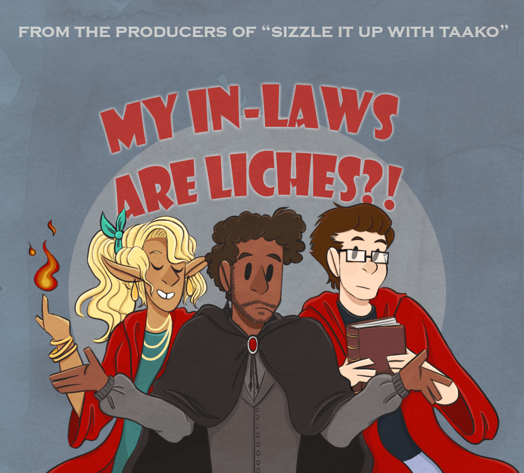 [image description: a drawing of Kravitz, Lup and Barry in the style of a promotional photo. On the top, it says: “From the producers of Sizzle It Up with Taako: My In-Laws Are Liches?!” Kravitz is standing front and center, shrugging with a slight frown. He’s a thin, dark-complexioned man with short, curly black hair and a five o’clock shadow. He’s wearing a black cloak over a gray shirt and vest. Lup and Barry are standing behind him on either side. They’re both wearing red robes. Lup is a skinny elf with light brown skin and long wavy blond hair pulled into a ponytail. She’s smiling with her eyes closed, casting a small flame out of a finger. Barry is a pale-complexioned man with short dark brown hair and glasses. He’s holding a book to his chest and has a neutral expression on his face.]