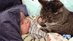 Fun fact: the cat is checking the baby’s mouth to see if it is still breathing. Were it not breathing, the cat would commence to eat it.
